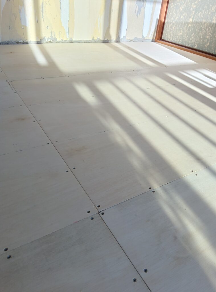 解体が完了したら、フローリングの土台となる合板をはめ込んでいきます。