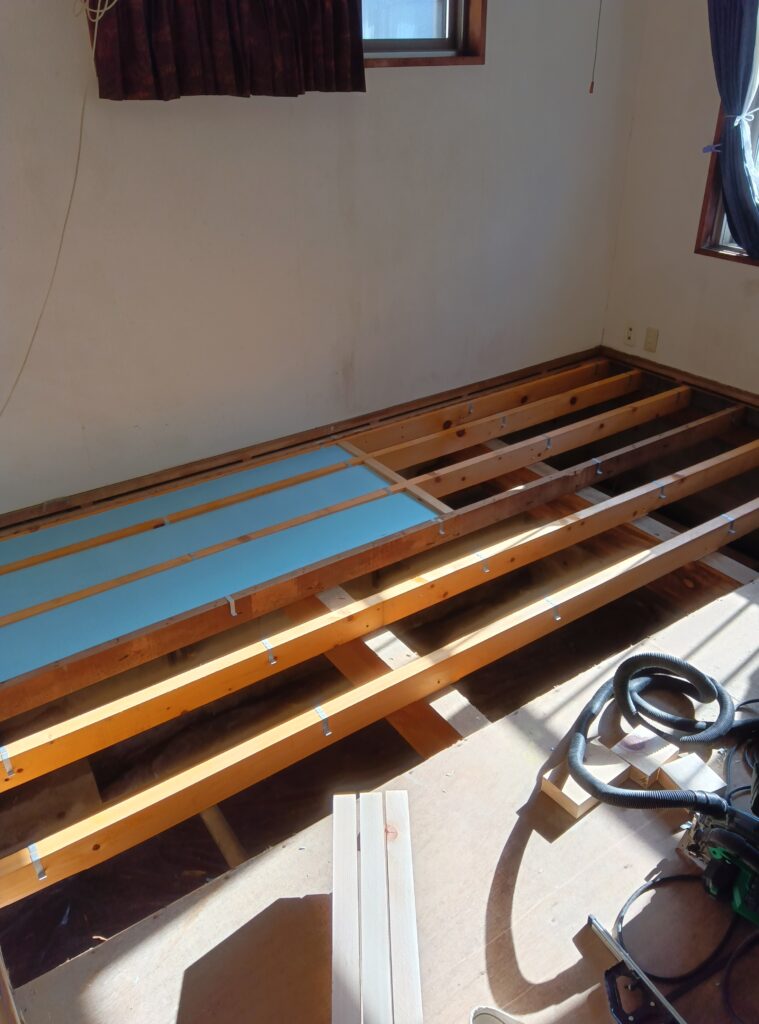 現在の規定では、根太は300mm間隔で入れることに変更されているため、まずはこの土台から作り変えていきます。